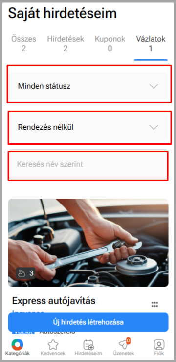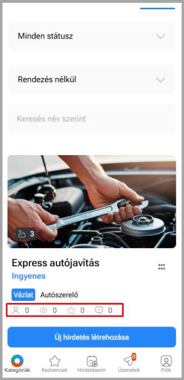Alatta pedig kereshetsz név szerint is, ha több hirdetésed van a platformon.
