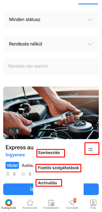 Szerkesztés – módosíthatod a hirdetésed tartalmát.