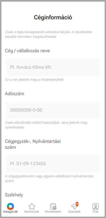 A céginformáció részben csak a legszükségesebb adatokat kérjük. A részleteket később bármikor kiegészítheted. Ne aggódj, ezek az adatok nem lesznek publikusak.