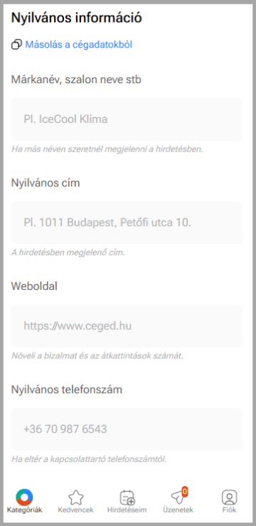 A nyilvános információ mezőben megadott adatok már publikusak, és bármikor módosíthatók. Ha nem szeretnél vesződni a kitöltéssel, kattints a Másolás a cégadatokból” opcióra.