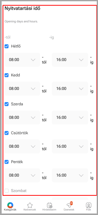 Jelöld be a napokat, amikor nyitva tartasz, majd válaszd ki az idősávokat.