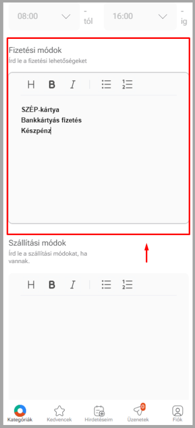 Add meg az elérhető fizetési lehetőségeket (készpénz, bankkártya, utalás, stb.).