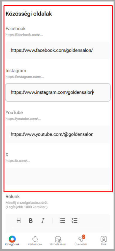 Megadhatod a vállalkozásod Facebook-oldalát, Instagramját, YouTube csatornáját, és X-fiókját (régebben Twitter).