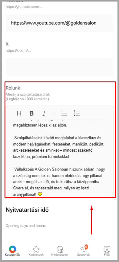 Minél részletesebb és vonzóbb tartalommal töltöd ki, annál több potenciális vásárlót érhetsz el. Ne feledd: a profi megjelenés és a jól megválasztott információk segítenek kitűnni a tömegből és növelni a bizalmat a márkád iránt.